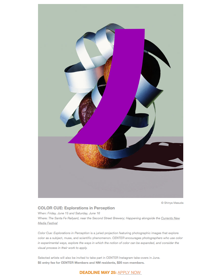 Color Cue: Explorations in Perception is a juried projection featuring photographic images that explore color as a subject, muse, and scientific phenomenon. CENTER encourages photographers who use color in experimental ways, explore the ways in which the notion of color can be expanded, and consider the visual process in their work to apply.